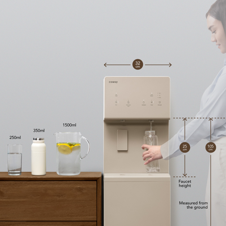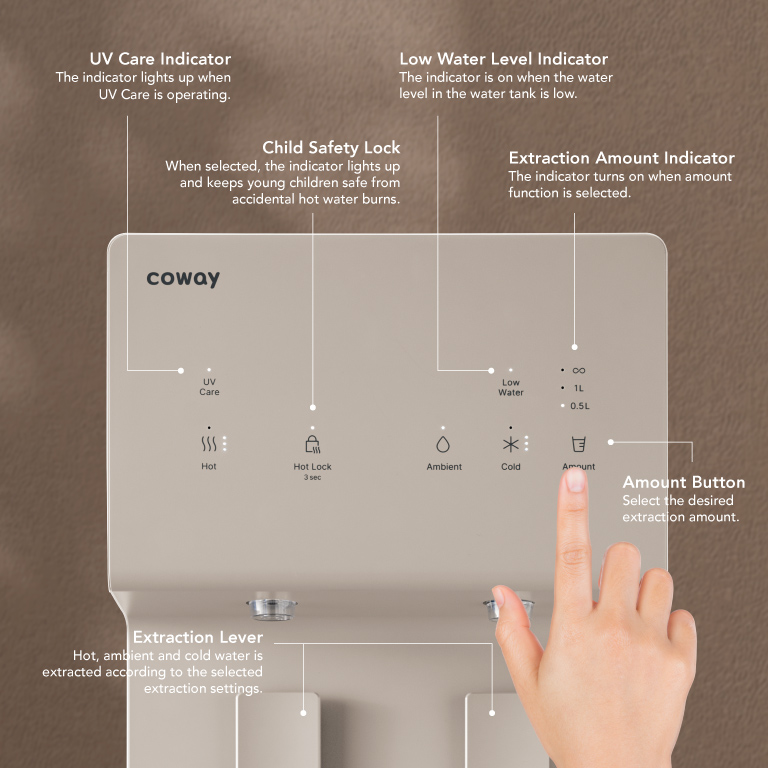 The first floor-standing Coway water purifier with 6-step filtration that consists of UV-Sterilisation in which ultraviolet-lit interior keeps